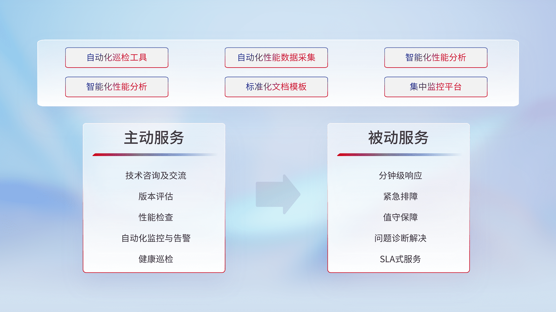 智能化工具和标准化文档,,,,保障服务质量,,,提供主动服务(包含技术咨询、、、版本评估、、性能检查、、自动化监控与告警、、健康巡检)和被动服务包含(分钟级响应、、紧急排障、、、值守保障、、、、问题诊断解决、、、SLA服务)。。。